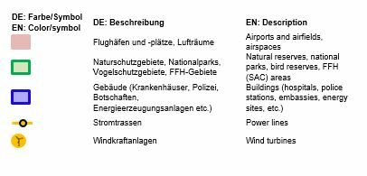 - Grundstücken, auf denen die Verfassungsorgane des Bundes oder der Länder oder oberste und obere Bundes- oder Landesbehörden oder diplomatische und konsularische Vertretungen sowie internationale Organisationen im Sinne des Völkerrechts ihren Sitz haben, soweit nicht die jeweilige Stelle dem Betrieb ausdrücklich zugestimmt hat (§ 21b Abs. 1 Nr. 4 LuftVO),